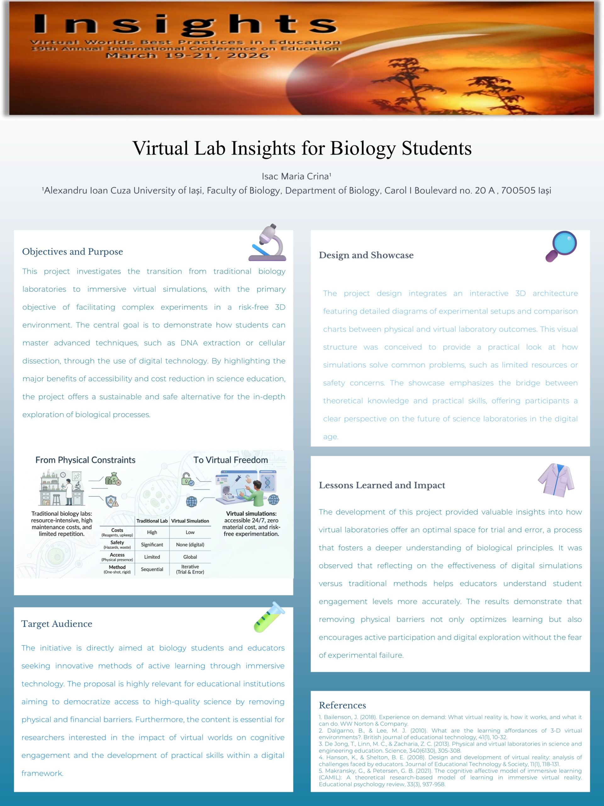 This poster explores the transition from traditional biology labs to immersive virtual simulations. The content examines how students can perform complex experiments such as DNA extraction or cellular dissection within a risk free 3D environment. The visual display includes comparison charts between physical and virtual lab outcomes and diagrams of interactive experimental setups. This approach highlights the benefits of accessibility and cost reduction in science education. Participants will see how virtual laboratories provide a space for trial and error fostering a deeper understanding of biological processes through active participation and digital exploration.