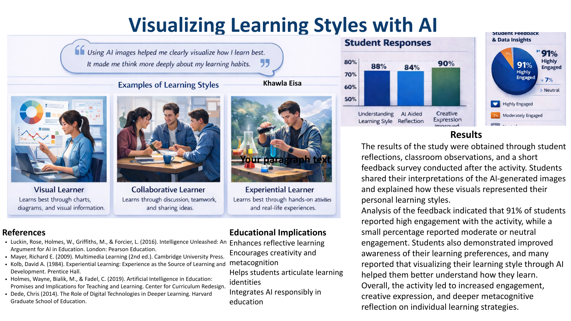 This poster presents an innovative classroom activity in which students used AI image-generation tools to creatively represent their individual learning styles. By translating abstract learning preferences into visual form, students engaged in reflective thinking, creative expression, and metacognitive awareness. The activity demonstrates how AI can be responsibly integrated to enhance student creativity, self-understanding, and engagement in learning.
